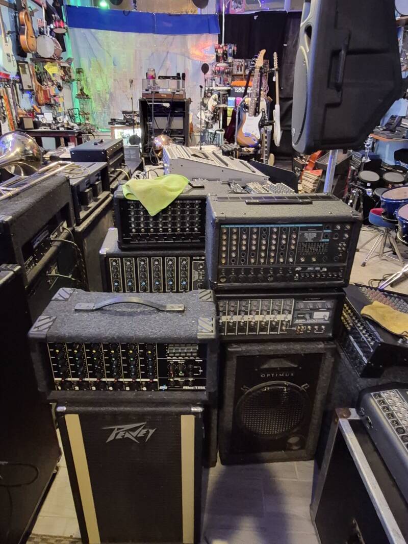 Power amps, mixing boards, effect petals, and more.